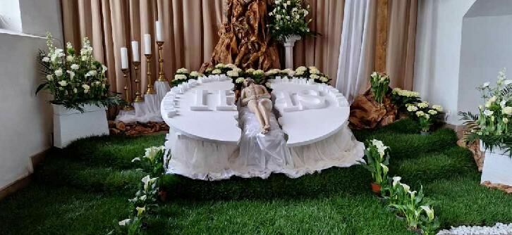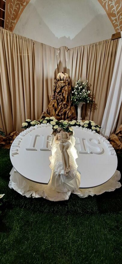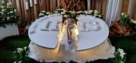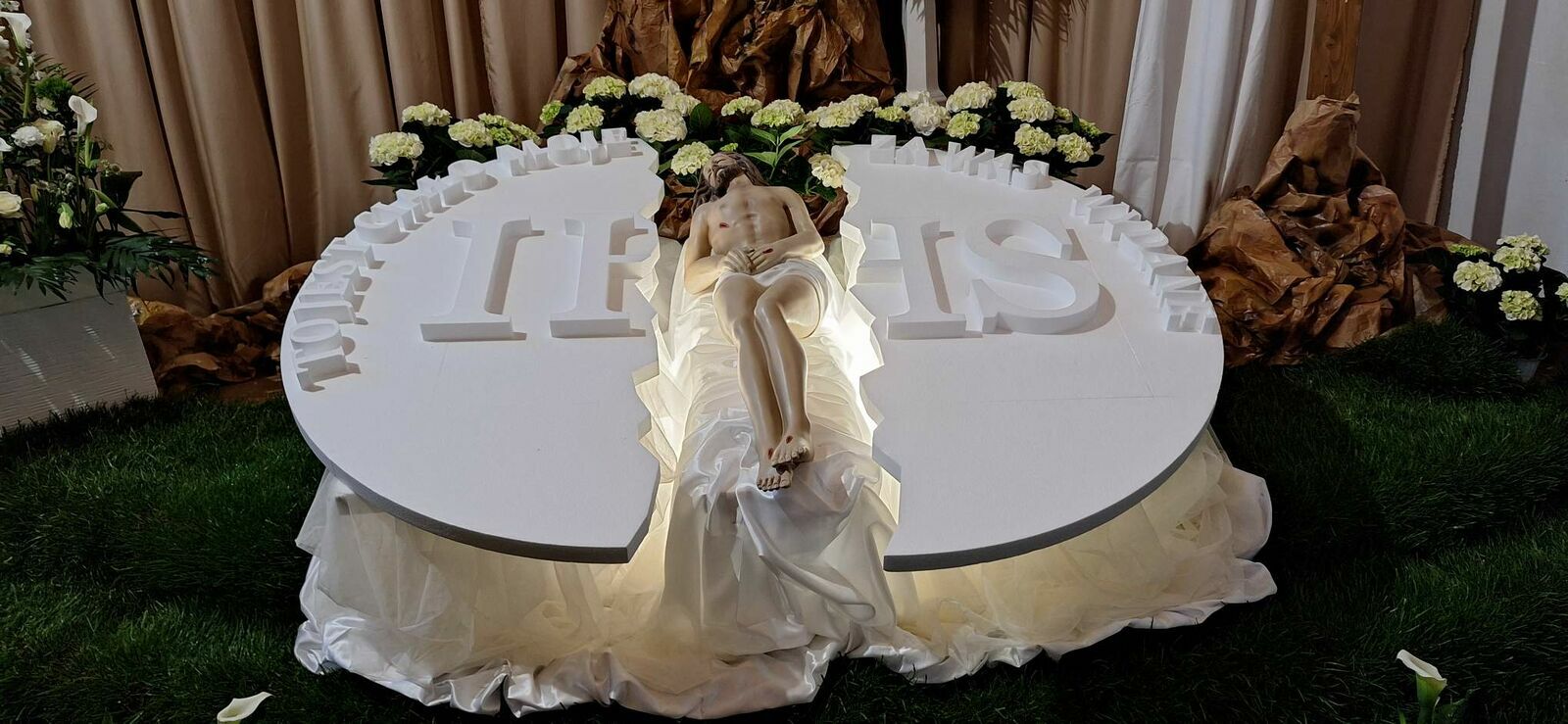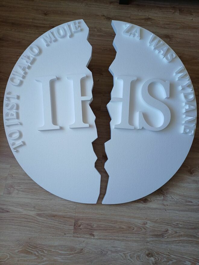 Przedmiotem sprzedaży jest hostia przełamana z napisem. Hostia jest ciekawym elementem dekoracji grobu Pańskiego.Hostia IHS oraz napis TO JEST CIAŁO MOJE ZA WAS WYDANE wykonane jest z twardego białego styropianu