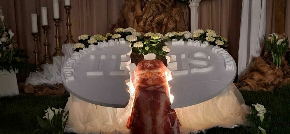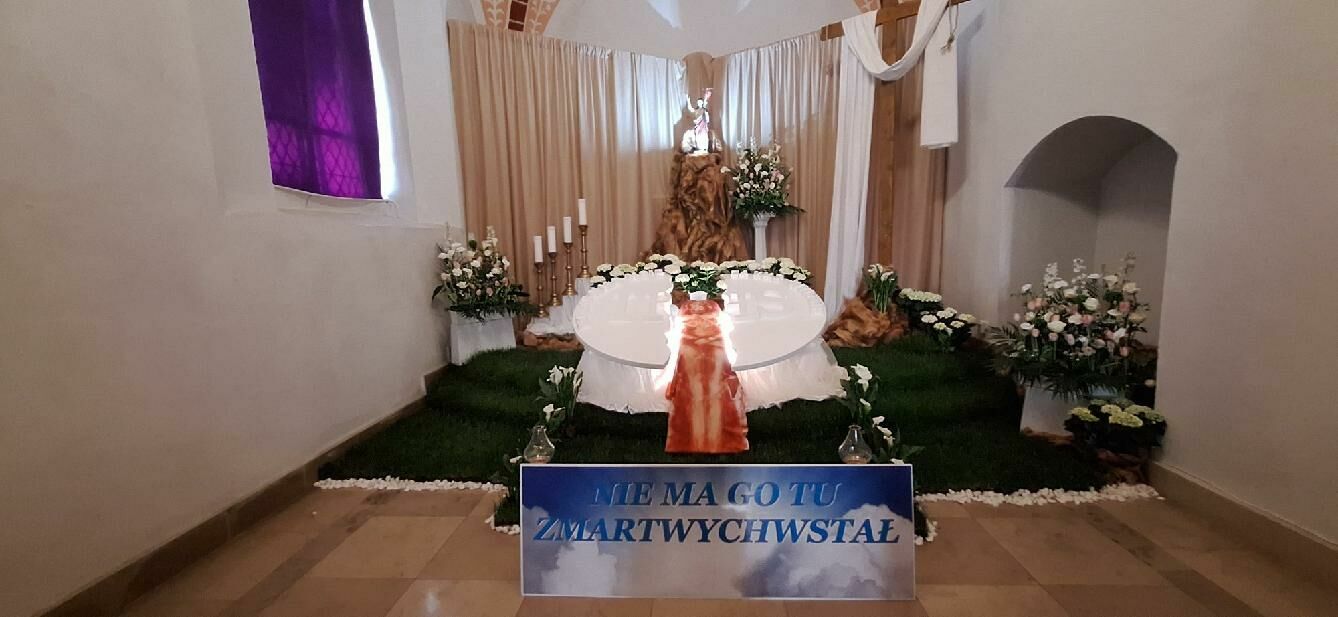 Hostia przełamana z napisem dekoracja Wiekanoc Grób Pański