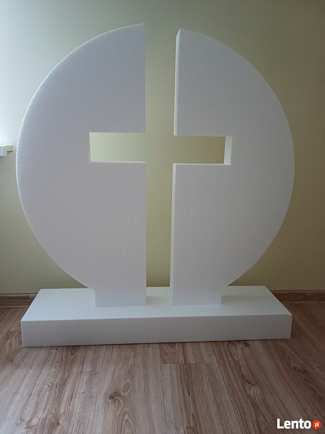 Przedmiotem sprzedaży jest krzyż w kole z podstawą, stanowi on oryginalną propozycję tła do wykonania dekoracji grobu Pańskiego.średnica koła - 100 cm