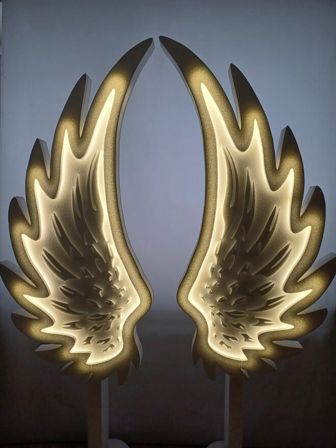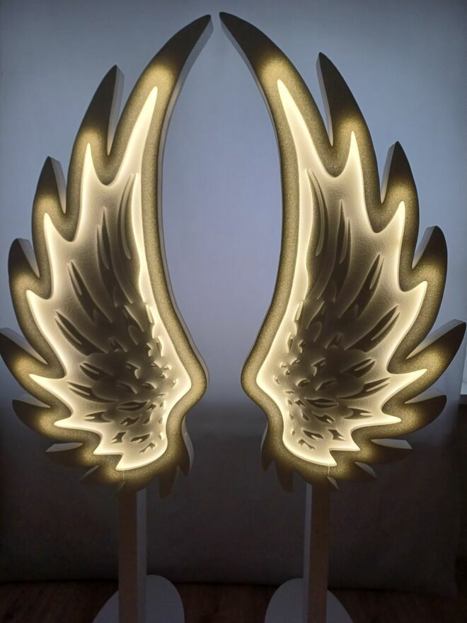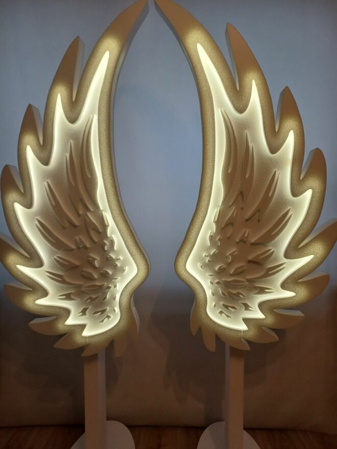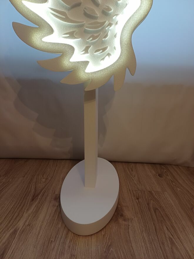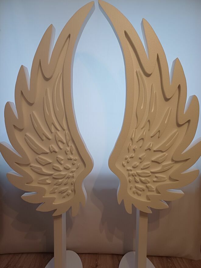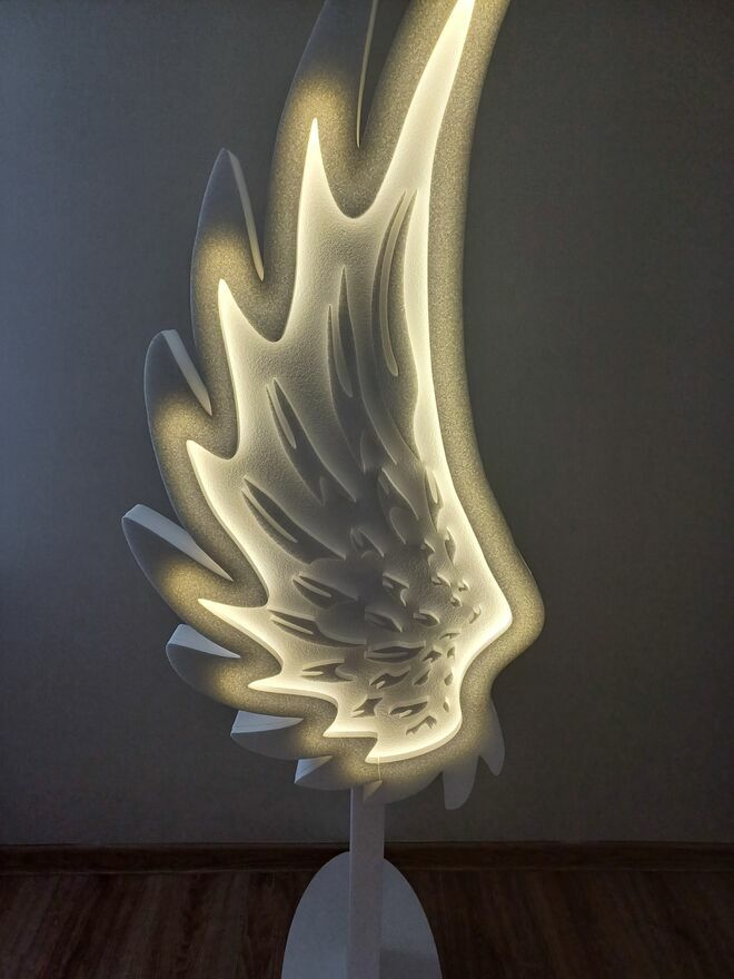 Skrzydła anioła w całości wykonane są z twardego styropianu, podświetlenie ledowe zasilane jest bateriami (3 szt paluszki w sprzedaży bez baterii).